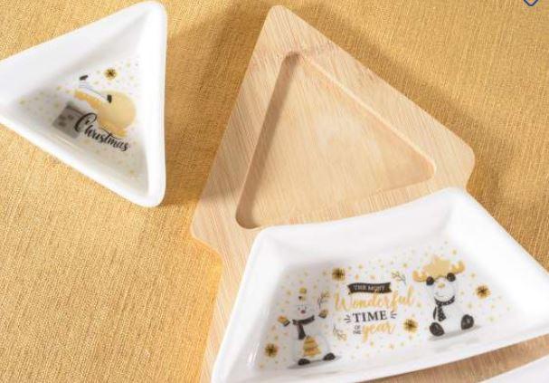 Service apéritif jaune avec 3 assiettes en porcelaine sur plateau, superbe décoration pour la table du réveillon de Noël.