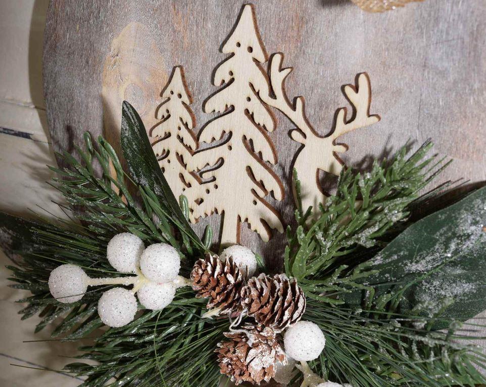 Tableaux en bois orné d'un renne avec paysage, branches, pommes de pin et noeud à accrocher