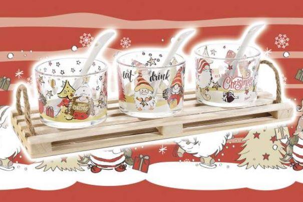 Service de table de Noël avec 3 soucoupes en verre avec une cuillère ornées de décorations de Noël sur un plateau/palette en bois naturel, parfait pour la table du réveillon.