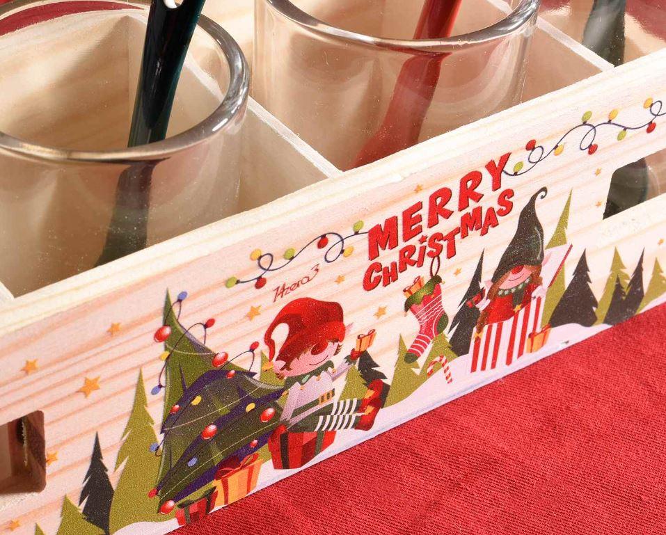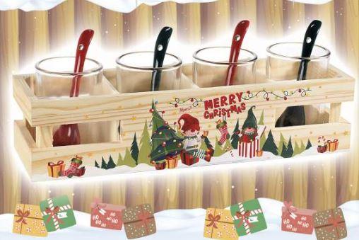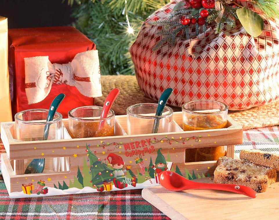 Service de table de Noël avec 4 soucoupes en verre avec une cuillère ornées de décorations de Noël sur socle en bois naturel et décoré, parfait pour la table du réveillon.