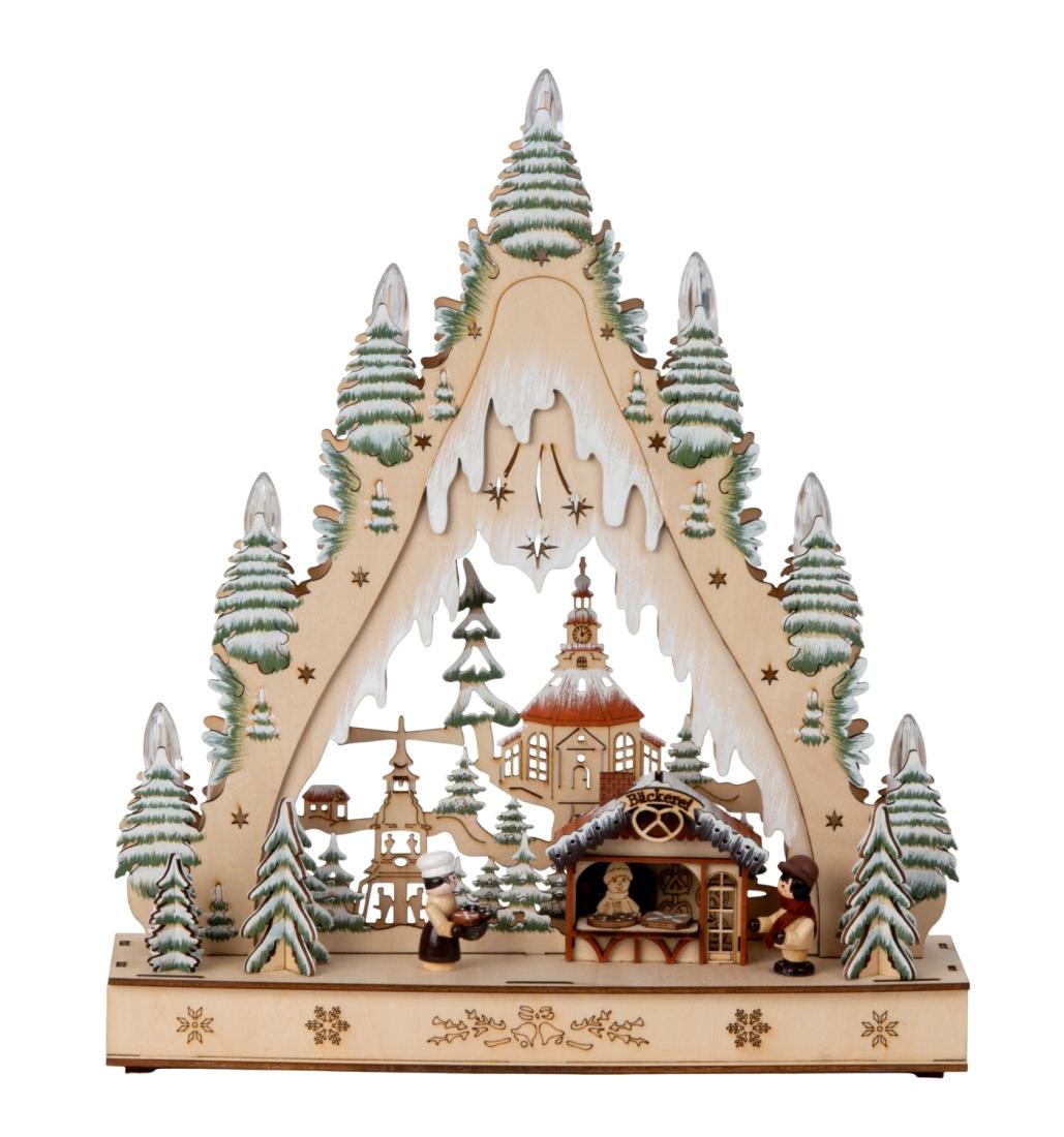 Décoration en bois naturel en forme de sapin avec un village de Noël, s'ilumine avec des lumières LED, fonctionne avec 2 piles LR 6 AA 1.5V non incluses, idéale pour une soirée féérique. Cette décoration de Noël est faite à la main, en utilisant un processus d'affûtage pour corriger les dentelures du produit afin de le rendre plus arrondi et beau, lisse et non invasif, afin de fournir une décoration de Noël à la fois de valeur et de qualité.