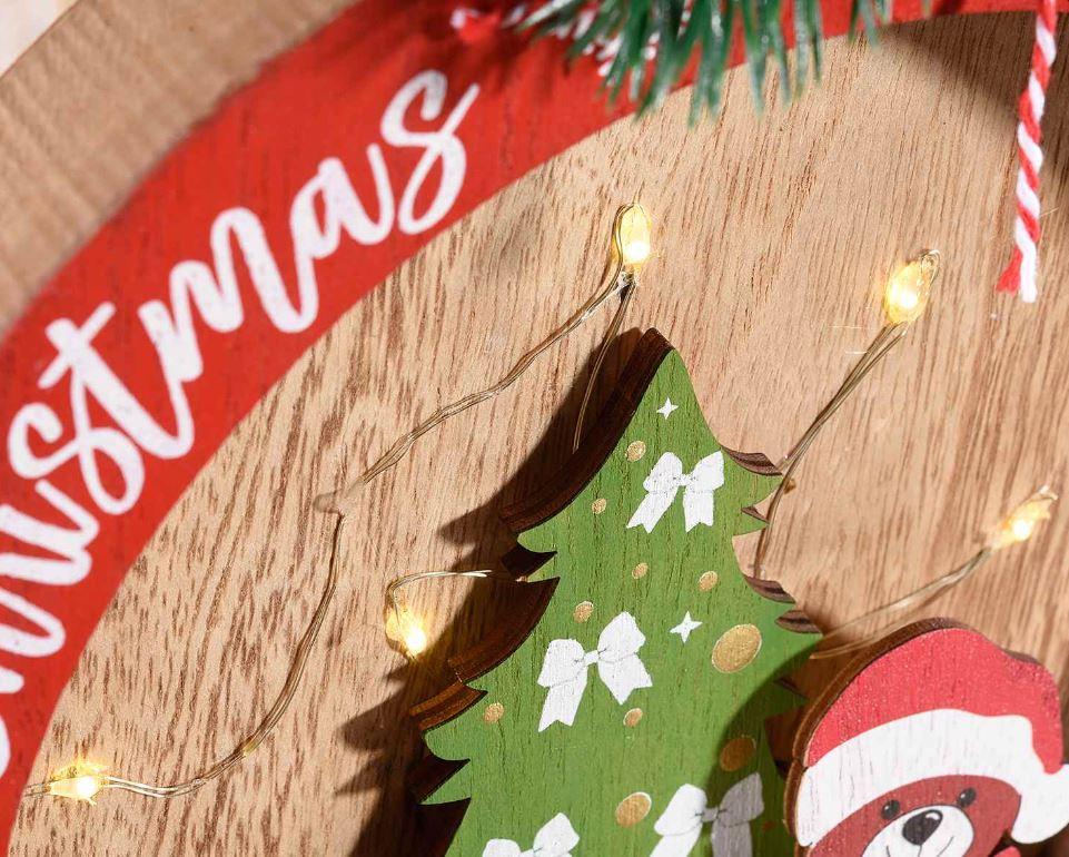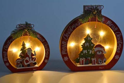 Lot de 2 décorations de boules de Noël en bois sculpté avec pin avec lumières LED, personnages de Noël, aiguilles de pin et nœud à placer, fonctionne avec piles incluses, parfait pour orner votre maison, pour les fêtes de fin d'année. Cette décoration de Noël est faite à la main, en utilisant un processus d'affûtage pour corriger les dentelures du produit afin de le rendre plus arrondi et beau, lisse et non invasif, afin de fournir une décoration de Noël à la fois de valeur et de qualité.